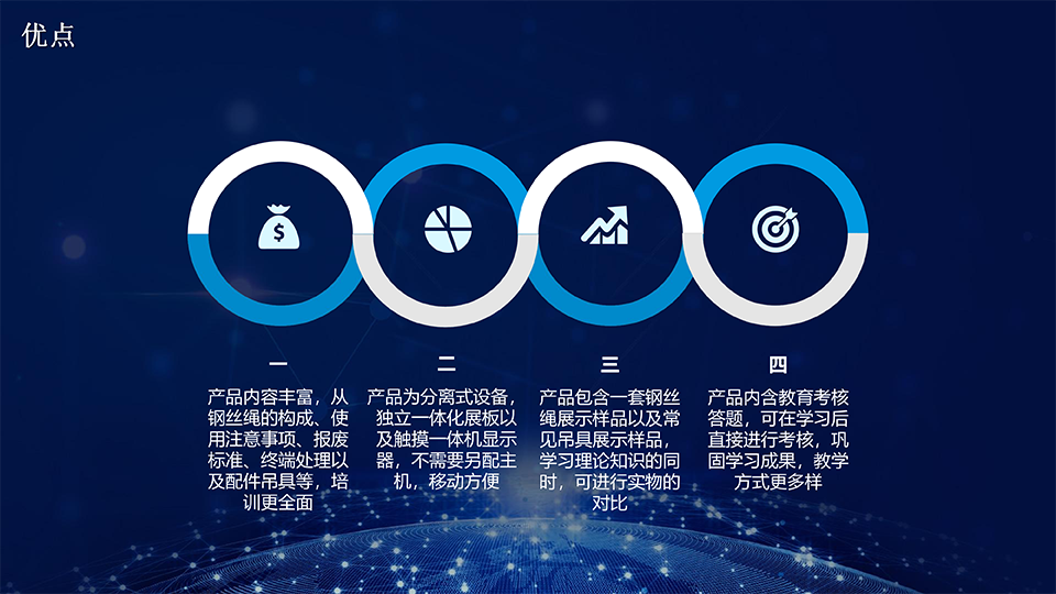 从钢丝绳的简介、组成、分类、生产工艺、常见报废类型、终端处理方式、配套吊具介绍等,再配以部分实物展示,最终辅以理论答题考核,多方面教育互补,大大增强教育效率。